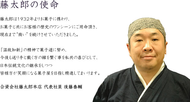 藤太郎は1932年よりお菓子に携わり、お菓子と共にお客様の歴史のワンシーンにご用命頂き、現在まで“商い”を続けさせていただきました。「温故知新」の精神で菓子道に努め、今後も送り手と戴く方の縁を繋ぐ事を私共の喜びとして、日本伝統文化の継承をしつつ皆様方が笑顔になる菓子屋を目指し精進してまいります。