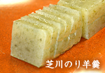 This is a red bean paste jelly which contains the Fujinomiya's local specialty laver seaweeds (SHIBAKAWA-NORI). It is said that those laver seaweeds have been presented to government and imperial court of Japan in Muromachi and Edo era. We knead those laver seaweeds which yield is getting lower and lower into red bean paste jelly (YOKAN).
